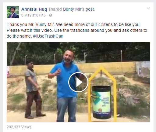 পরবর্তীকালে তার সচেতনতামূলক ভিডিও দেখে অনুপ্রানিত হয়ে স্বয়ং মেয়র আনিসুল হক তার নিজ ফেসবুক অফিসিয়াল পেইজ থেকে শেয়ার করেছেন তার একটি ভিডিও, তাকে দিয়েছেন প্রানখোলা অভিবাদন। প্রচলন করেছেন#IUseTrashCan নামে একটি হ্যাশট্যাগ।